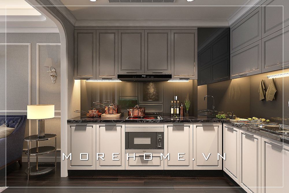 Không gian phòng bếp với thiết kế cách điệu theo phong cách tân cổ điển, sang trọng kết hợp thiết bị bếp hiện đại giúp căn bếp tiện nghi hơn