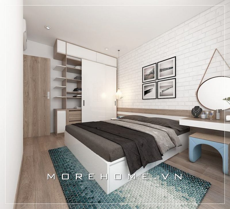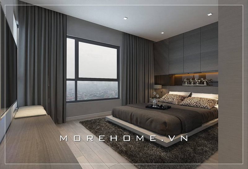Thiết kế nội thất phòng ngủ chung cư hiện đại và đơn giản bằng cách sử dụng mẫu giường ngủ gỗ công nghiệp có dáng thấp thanh mảnh nhưng vẫn đảm bảo chất lượng và an toàn.